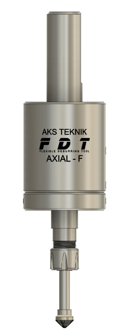 FDT AXIAL (F) is a simple and economical spindle-driven deburring tool for use on CNC machining centres, NC machines, and industrial robots. By constantly pressuring the cutting edge against the workpiece surface in the axial (Z-axis) direction, FDT AXIAL (F) reliably deburrs the sides and faces of machined parts.